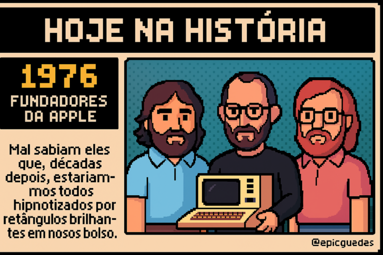 Três jovens barbudos em uma garagem da Califórnia fundam uma empresa chamada… Apple. Isso mesmo. Apple, como a fruta. Porque aparentemente “Computador do Tio Steve” não parecia profissional o suficiente.